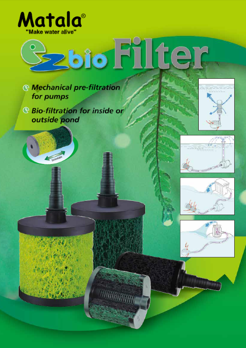 簡易的物理及生物過濾器,裝設在馬達入水口,可保護馬達、避免異物吸入,也可作為流水造景、噴水池等簡單過濾之用