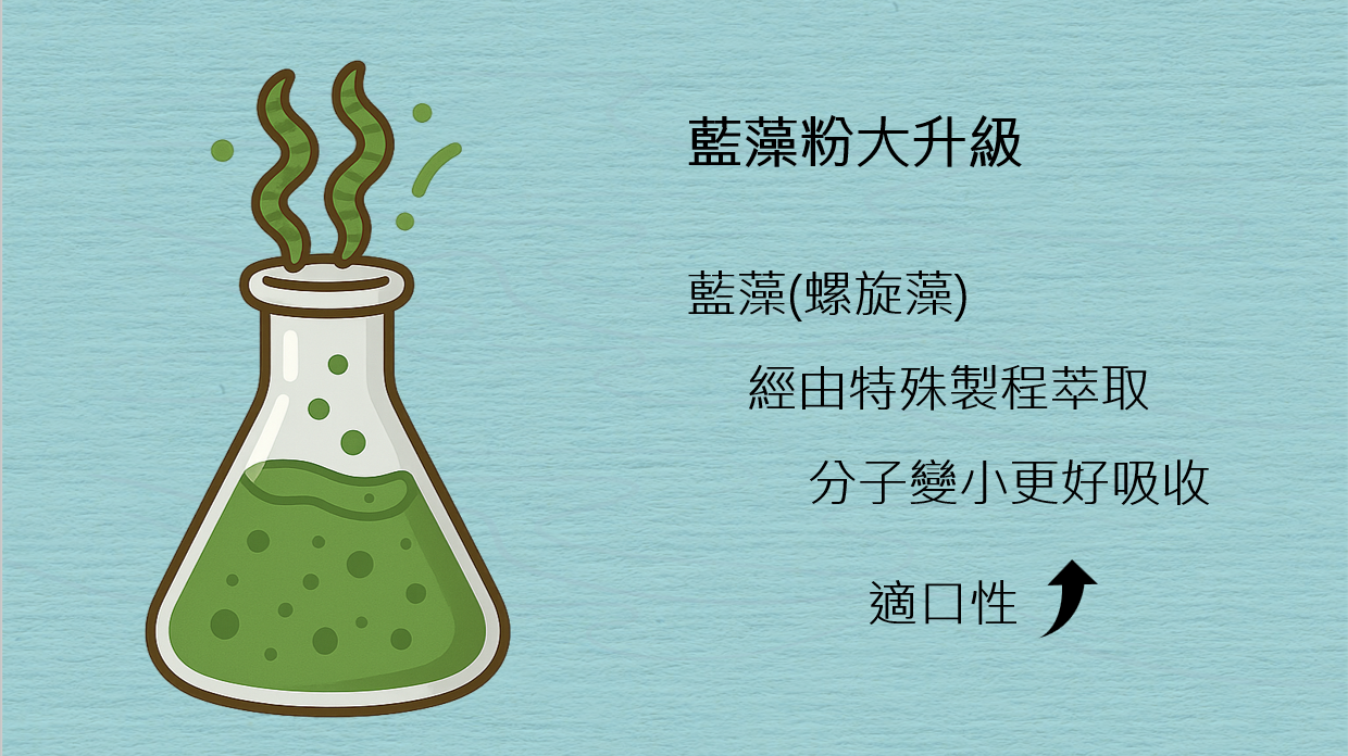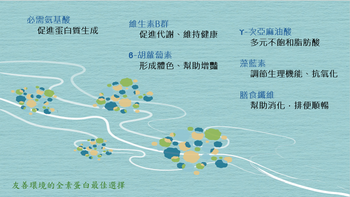 藍藻(螺旋藻)蛋白,經由特殊製程萃取,保留藍藻豐富的氨基酸及蛋白質,更富含多種維生素、礦物質、多元不飽和脂肪酸(亞麻油酸、次亞麻油酸)、膳食纖維等營養素,萃取過後分子變小更好吸收,並提升適口性,是友善環境的全素蛋白最佳選擇