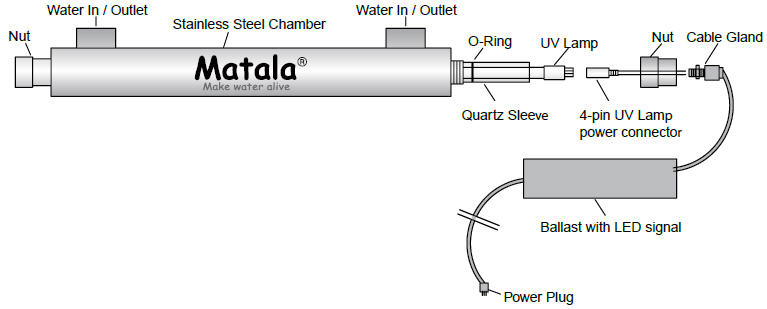 裝設簡單,僅需將燈管接上4孔燈座,放入石英管中(金屬蓋不需轉開),再鎖上塑膠蓋即可