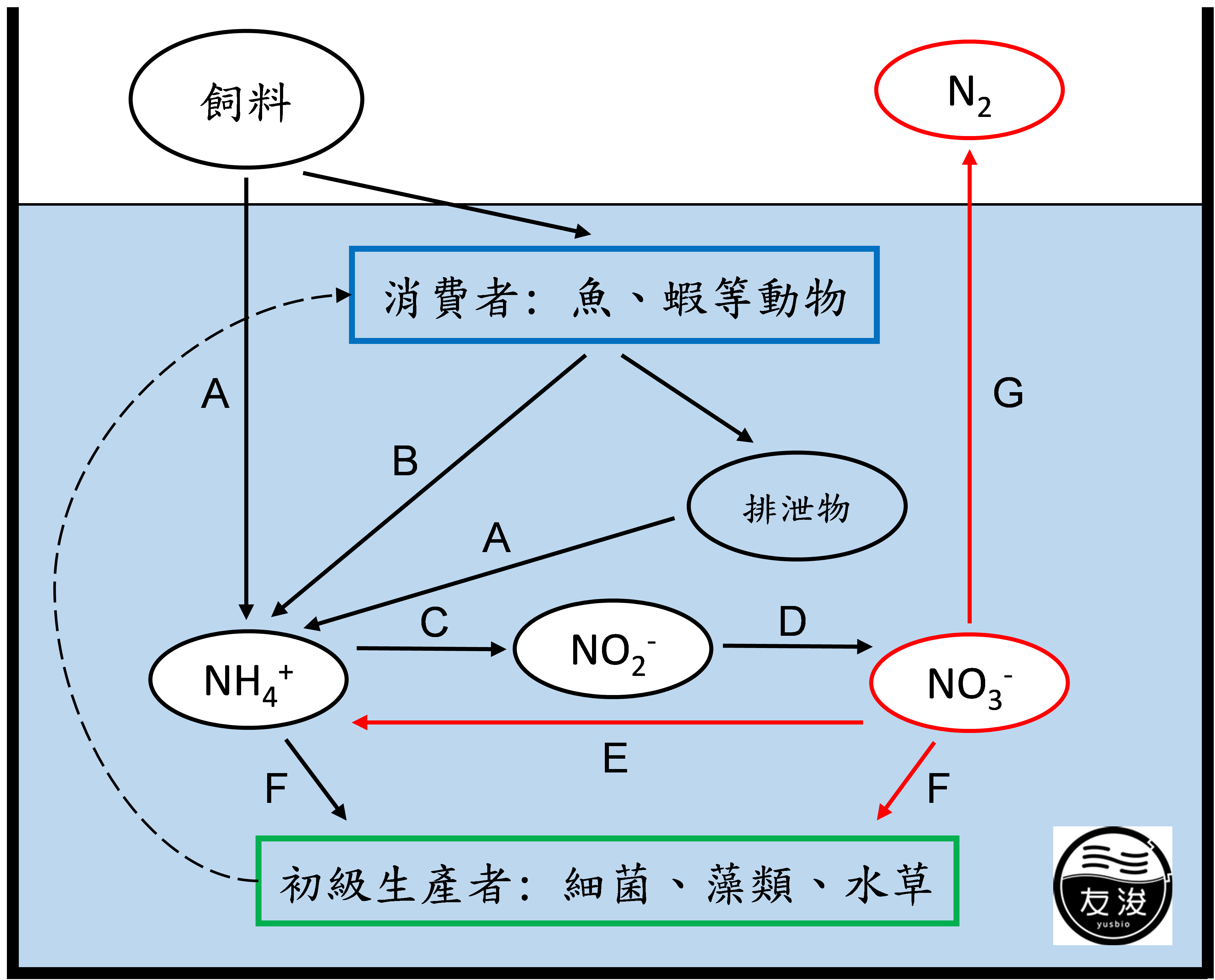 *註: 固氮作用 (nitrogen fixation) 與無氧氨氧化作用 (anammox) 對一般水族箱的影響較微弱,故未放入此圖。