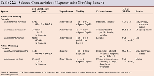 根據第一版的Bergey’s Manual (1984),硝化細菌 (Nitrifying Bacteria) 是一群能夠利用化學能固定CO2作為碳源之格蘭氏陰性菌 (chemoautotrophic, 化學能自營性)。第二版的Bergey’s Manual (2001) 將硝化細菌做更進一步的分類,其分屬於α-、β-、γ-proteobacteria,具有不同之形態生理特徵(見下表)。由於此類細菌的研究較早,因此許多學術文章所指的硝化細菌 (專有名詞) 是Nitrosomonas、Nitrobacter…等的格蘭氏陰性自營菌。