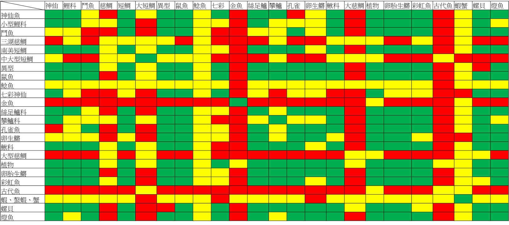 最後,附上常見魚種的混養表: