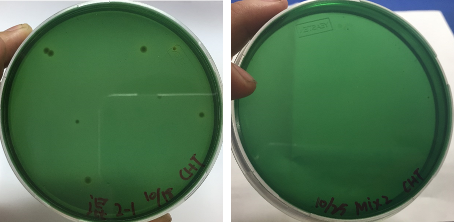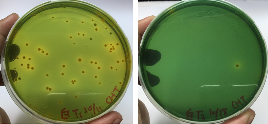 從實驗結果發現,在使用含有B. pumilus D5的產品一週後,不論室內苗場(圖3)或室外混養池(圖4),水中弧菌量皆有明顯下降(圖片左方培養基為使用前,右方為使用後),原本室內苗場池水中,弧菌量已達可能致病的濃度,卻在一週後降低至安全濃度,抑制效果高達99%,而在室外混養池中,弧菌量也有明顯降低 (表2),此項結果也顯示,B. pumilus D5用以生物控制上相當有效,效果甚至比其他文獻所述還要優秀。