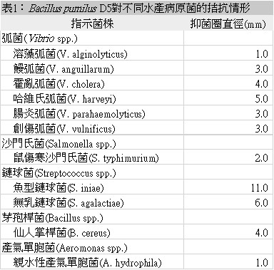 其中水產試驗所研發之短小芽孢桿菌B. pumilus D5已被證實具有多樣抗病原能力,不僅能拮抗蝦類主要的細菌性疾病病原,包括溶藻弧菌(Vibrio alginolyticus)、腸炎弧菌(V. parahaemolyticus)、哈維氏弧菌(V. harveyi)等,魚類病原的哈維氏弧菌、鰻弧菌(V. anguillarum)、創傷弧菌(V. vulnificus),甲魚病原的仙人掌桿菌(Bacillus cereus),瓶鼻海豚鏈球菌(Streptococcus iniae)、S. agalactiae (無乳鏈球菌)等...(Huang et al., 2016),根據文獻(Aly et al., 2008)及本公司的對峙培養實測,D5也能拮抗淡水觀賞魚最常見的親水性產氣單孢菌(Aeromonas hydrophila)(表1)。