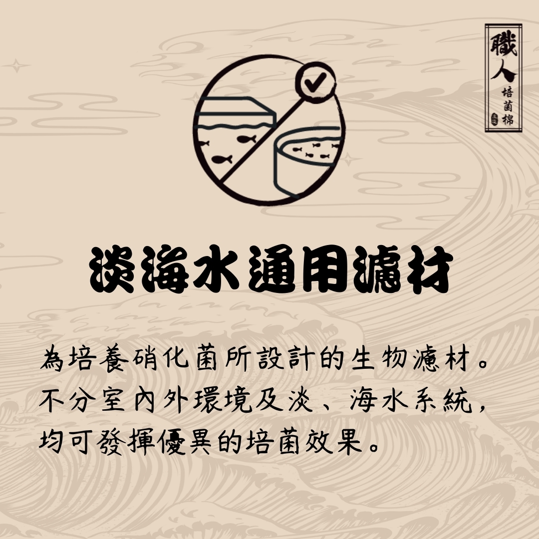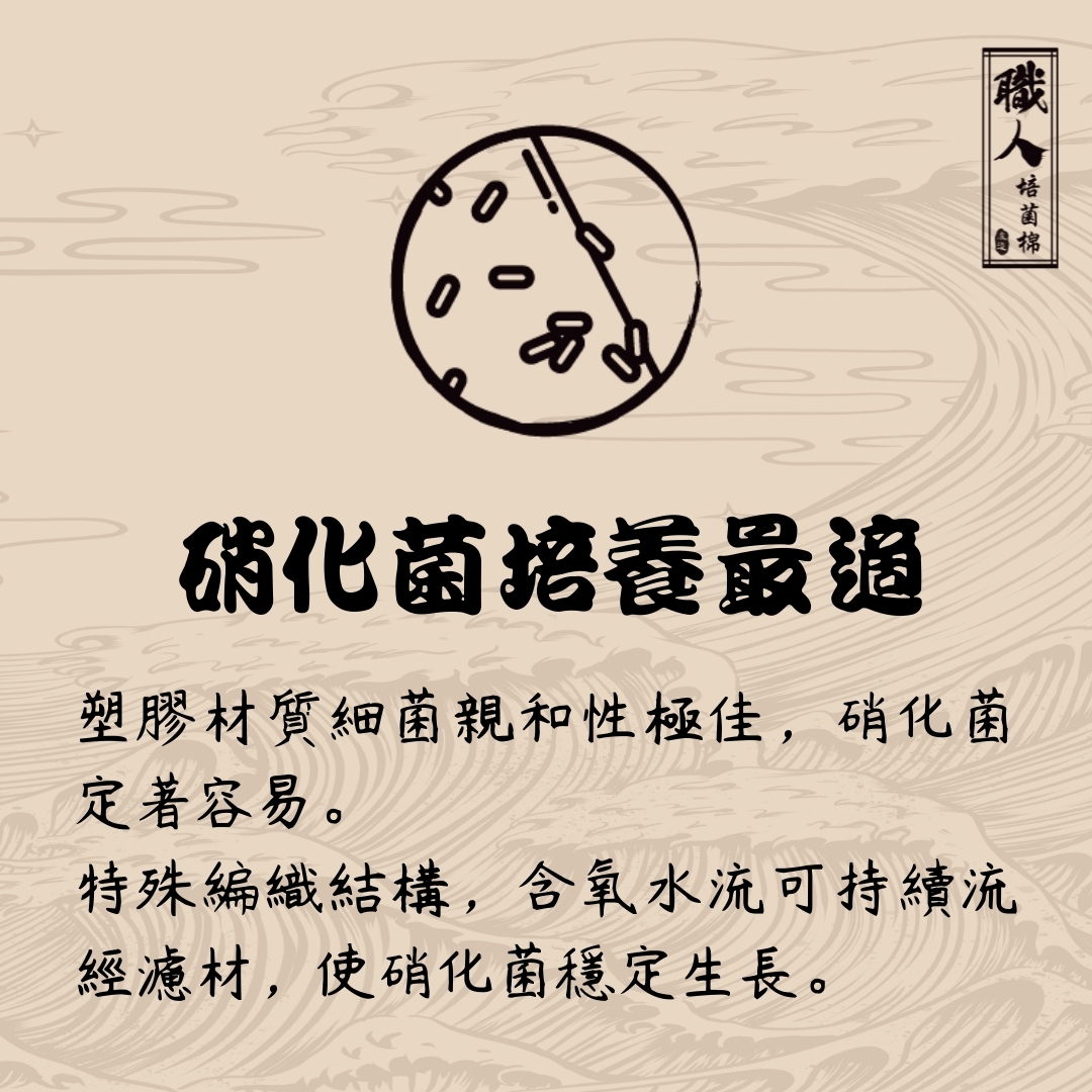 友浚團隊一直以來有個秘密,那就是我們自己使用的過濾棉並非市售的生化棉,原因也不是什麼黑科技,純粹是我們沒太多時間去顧魚缸,所以使用了最不用費力清洗維護的方法而已,可惜的是這種棉雖好用但卻不是好商品,因為商品壽命太長並不利於銷售活動,無奈的是友浚這個秘密被來公司參觀的大大給發現了,力挺之下,我們決定將這款棉公諸於世,他就是-職人培菌棉職人培菌棉的功能分類上屬於培菌用的生化棉,由捲曲纖維熱聚丙烯化合物(TPPC)或熱聚乙烯化合物(TPEC)製成,有別於一般以PVC為材質的產品,他的絲徑較粗,物理結構性強不易坍塌,且最重要的是,材質對生物無毒性,因此硝化菌的親和性相當高,雖然比表面積460 m2 /m3並不算特殊,但他的孔隙率達到94%,意味著能維持相當高的溶氧,能充分利用整個3-D空間,而當水流流經此棉,特殊的編織結構能引導水流形成湍流,湍流能分散水流並導致水流過的路徑變長,強迫水與硝化菌更長和更密集的接觸,而充足的孔隙空間也有利於生物膜的形成,並讓過濾棉可以容納大量污泥(自身重量的 10 倍)而不會堵塞,重點是,好清洗維護,用在魚缸環境中通常半年~一年沖洗一次即可,清洗時可用一般水龍頭沖洗,是名符其實的"懶人濾材"