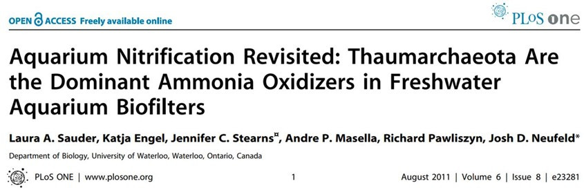 關於魚缸中的古細菌研究可追朔到2011年發表於PLOS one的文獻(下圖),該文章是加拿大滑鐵盧大學 (University of Waterloo) 生物學系的研究,實驗方法是調查位於安大略省的三個城市,選取放置於商店、住家…等共35個魚缸 (8海水、27淡水),將這些魚缸過濾器中的生物性濾材 (羊毛絨、生化棉) 取下,萃取其上附著生物的DNA,再分別利用針對細菌與古細菌設計的引子 (primer) 對16S rRNA 和 amoA基因做定量性PCR (Quantitative real-time PCR)。