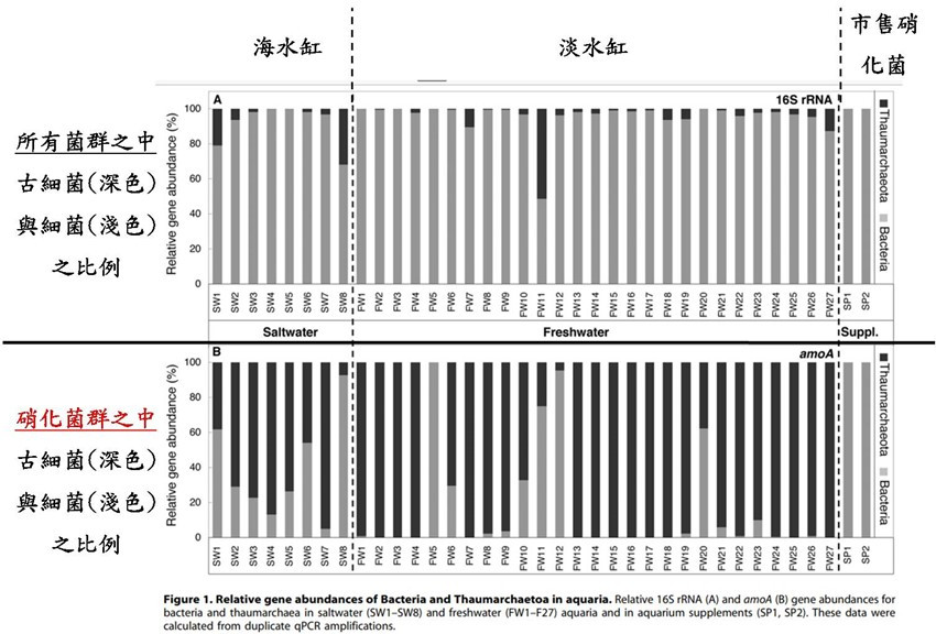根據 16S rRNA 基因分析結果,發現在絕大部分魚缸的生物濾材上細菌相較古細菌占了絕對的優勢;相反的,具有氨氧化能力的硝化菌中,古細菌比細菌還要多出數倍 (下圖)。附帶一提,該研究也分析了兩種市售硝化菌商品 (SP1、SP2),並未偵測到任何古細菌的存在,而魚缸FW12、FW13、FW19和FW25有使用市售硝化菌產品開缸,但其中三個魚缸 (除了FW12) 的優勢氨氧化菌皆為古細菌。