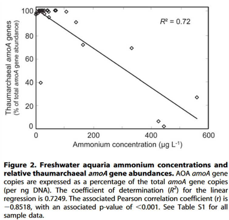 該研究更進一步分析魚缸中的氨濃度與氨氧化古細菌(以下簡稱AOA)與氨氧化細菌(以下簡稱AOB)之間的推估比例,結果發現兩參數有顯著的負相關,AOA越優勢的魚缸,測到氨的濃度就越低。甚至有數個氨濃度接近零的魚缸其AOA/AOB比例達到100% (下圖)。