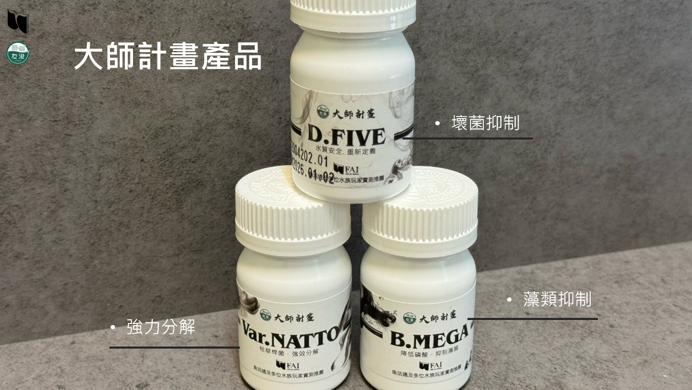 大師計畫,作為友浚菌粉產品線的最後一塊拼圖,從方便使用的有菌乖乖、開護缸達人,到大水量進階玩家使用的水色職人,最後是針對特殊用途的大師計畫,一路走來,從達人到職人再到大師,總算是完成整個菌粉系列了,但友浚的研發腳步不會停止,更方便有效的益生菌相關產品將會陸續呈現在魚友眼前,希望我們的努力能讓水族圈一天比一天進步