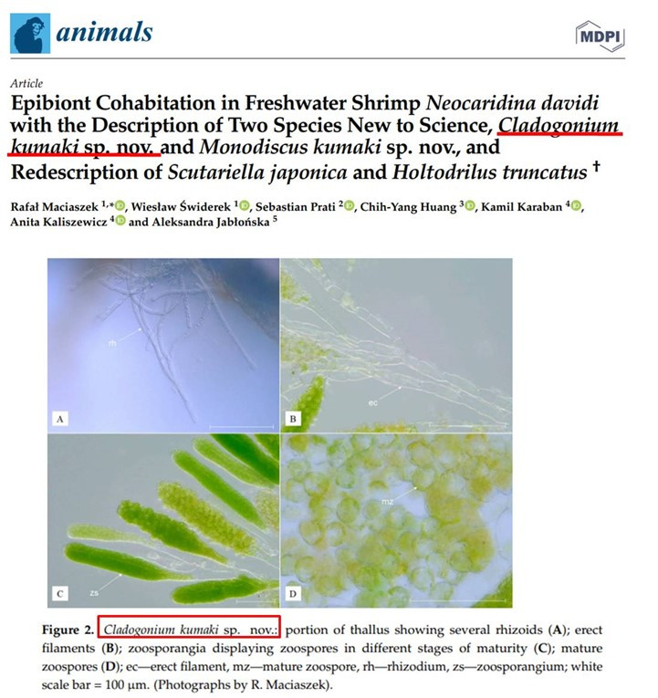 友浚曾在2018年收集多個國外觀賞蝦論壇及相關文獻資料,推斷此現象與Ellobiopsis的描述最為相似。2021年,有文獻提供明確的分類證據,18S rRNA基因定序顯示此生物為綠藻門 (Chlorophyta) 剛毛藻科 (Cladophorales) 的Cladogonium 而非我們原本推測的Ellobiopsis。去年 (2023年),學者更進一步發表新物種:Cladogonium kumaki。友浚本著實事求是的科學精神,以目前最新的學術文章為依歸,更正之前的錯誤說法。