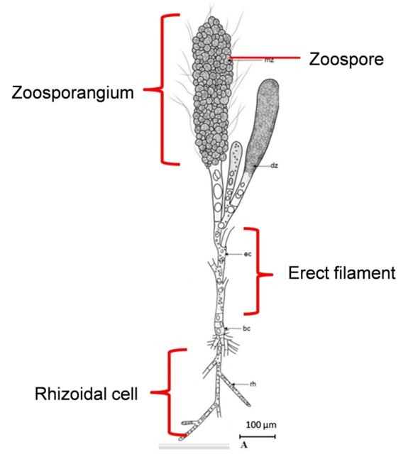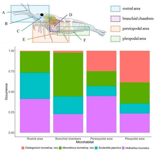 下圖呈現文獻中C. kumaki的構造,其葉狀體 (thallus) 由三個部分組成:游動孢子囊 (Zoosporangium)、直立絲狀體 (Erect filament) 及假根 (Rhizoid)。一般觀察到的黃綠色團塊其實是游動孢子囊,而文獻判定方式則是觀察絲狀體(用碘液染色)。如同許多絲狀藻,除了依靠游動孢子的有性繁殖外,利用絲狀體的裂片生殖(無性)也很普遍。產生游動孢子囊並非附生藻完成生活史的必要條件,大部分的情況C. kumaki是以肉眼難觀察的絲狀體附著在蝦身上,產生大量游動孢子囊的情況相對罕見。除此之外,雖然C. kumaki 主要出現在泳足的部位,但也有一定的比例附著在步足的區域,其他部位僅有零星分布(下圖)。
