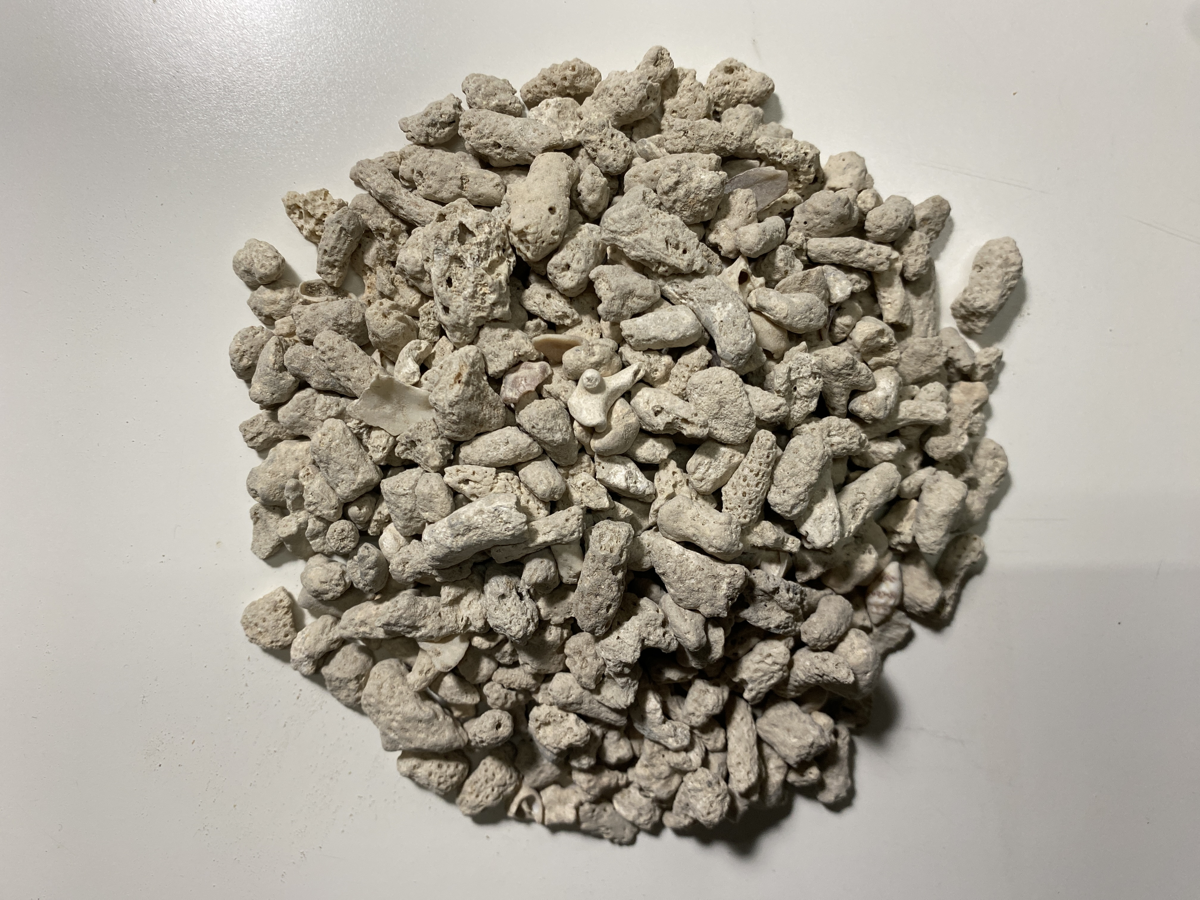 石質濾材例如珊瑚骨、陶瓷環、石英砂等...部分也兼具化學濾材功能,由於孔隙小,能形成表層好氧、內層相對厭氧的微氣候,可做為各式菌種的儲存庫,也有緩衝水質的功能,選擇上以質輕多孔為佳,需要注意的是由於孔隙太小極為容易堵塞,只要一堵住,反而會成為硝酸產生的源頭(只剩表面好氧層可以居住,內部則變成垃圾場),除了前段需做好有機質隔離之外,也建議要定期更換(基本無法清洗),另外以經驗來看他無法做為去除硝酸鹽的手段,使用量過多或太久沒更換的話容易累積巨量硝酸鹽,此時反而要大幅減少此類細孔隙濾材的量才能改善,且若是魚缸中有底砂(非土)、石質造景等...相同材質,也能取代其功能,且若石質濾材在過濾系統中佔比過大,也會大幅延長硝化系統建立時間,尤其是光滑表面或二氧化矽材質者,由於親和力弱,在培菌上需要更多時間