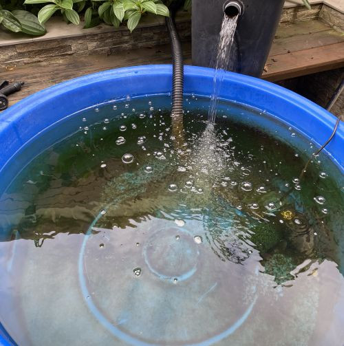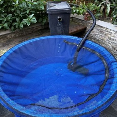 在清理水池時,務必要先將魚給移出,千萬不能在有魚的狀況下去攪動底質,否則會大大增加染病風險,此時養魚必備的檢疫缸/池,就派上用場了,有空間的話,還是建議使用一體成形的材質,穩固性會好得多,還有過濾器及防跳網也是必不可少的,整組設立起來不用五分鐘,相當簡便快速(桶子大小及防跳網有多種規格可選,一般飼養用500L即可)